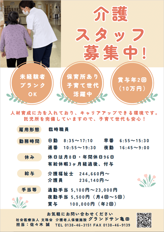 グランドサン亀田の現在の採用情報については、上記の連絡先にお気軽にご連絡くださいませ。