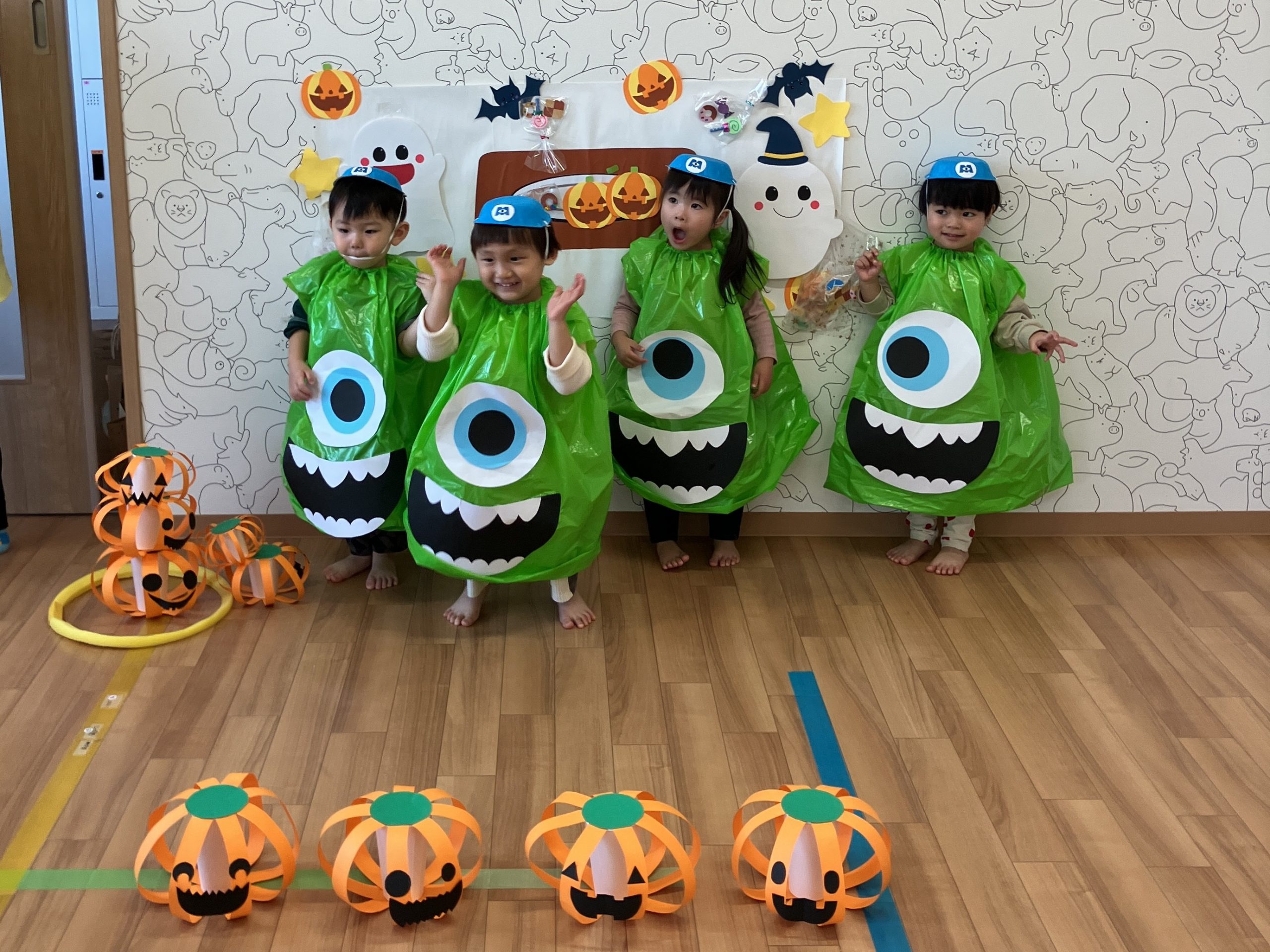 10/27(月) 石川かめっこ保育園のハロウィン行事を行いました🌟 今回は地域のお友達も園開放を兼ねて一緒に参加の、楽しいハロウィンパーティーのはじまりです👻 お部屋をのぞいてみると👀各クラス、仮装の準備ができたみたいで