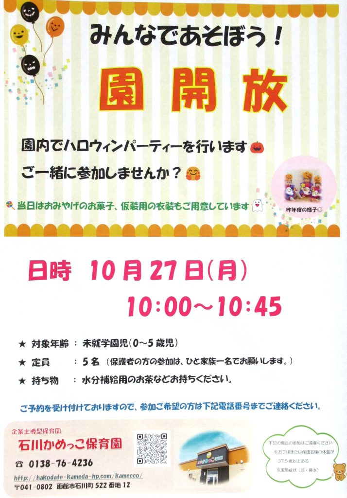 10月27日(月)石川かめっこ保育園にて、園開放を実施いたします🤗