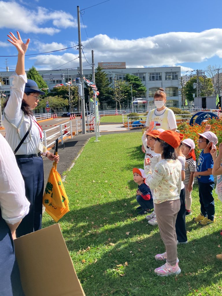 交通公園では、交通指導員さんから信号の見方、道路の渡り方などについてお話を聞きます🙋