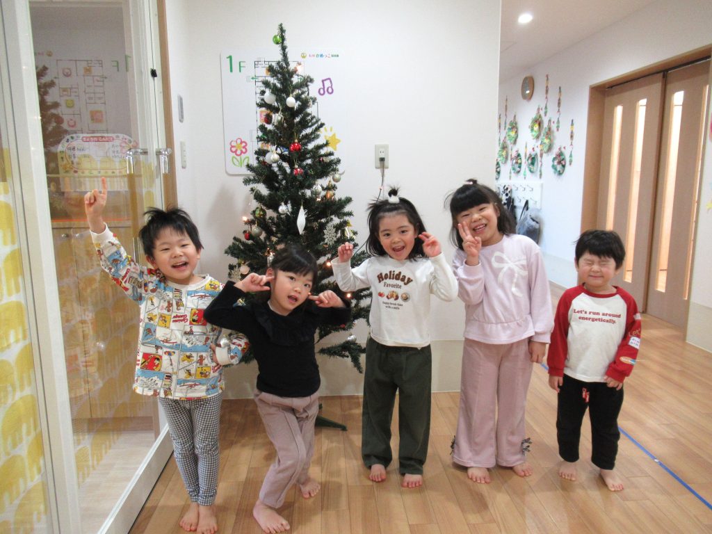 「サンタさん待ってるよ~🥰」と、みんなで飾り付けたツリーの前でハイポーズ📸